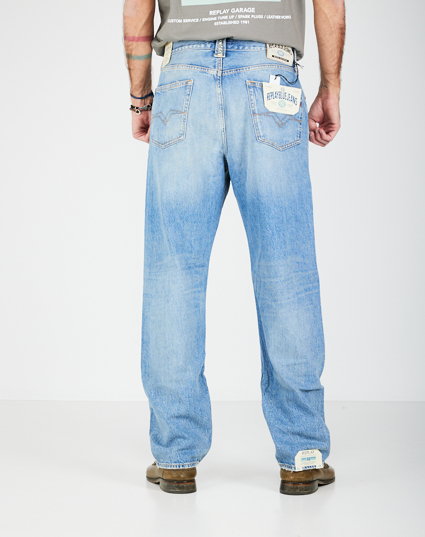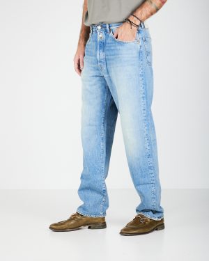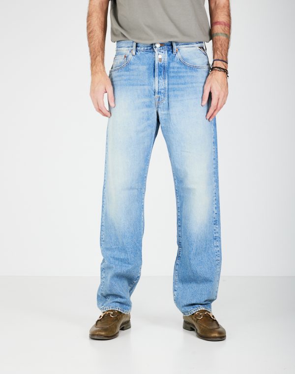 Jeans loose 5 tasche con cavallo morbido e fondo 23 cm. Chiusura con bottoni in metallo