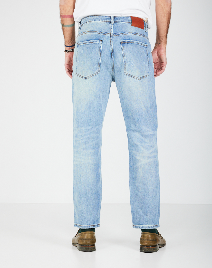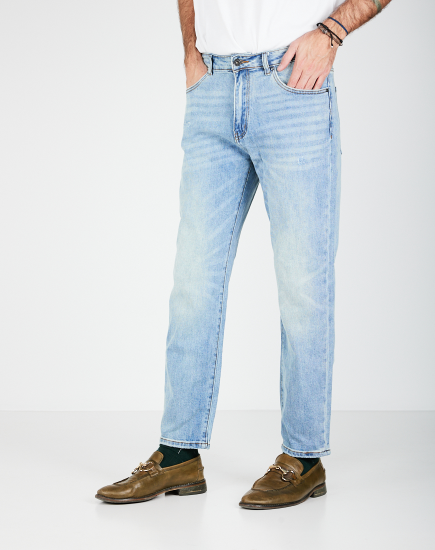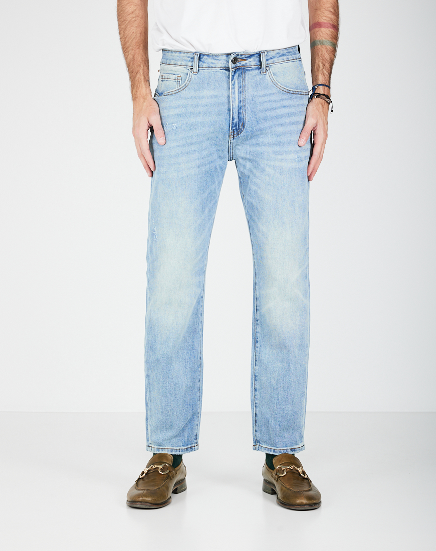 Jeans 5 tasche con cavallo leggermente basso e gamba regolare con fondo 19cm. Chiusura con bottone e zip