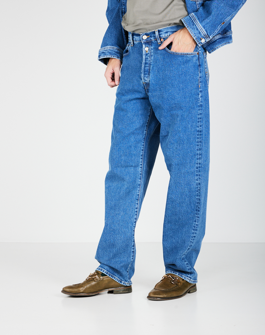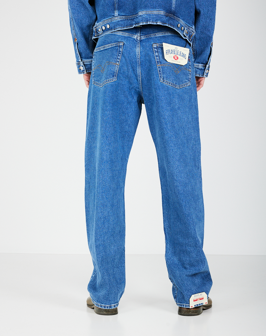 Jeans loose 5 tasche con cavallo morbido e fondo 23 cm. Chiusura con bottoni in metallo