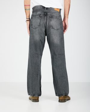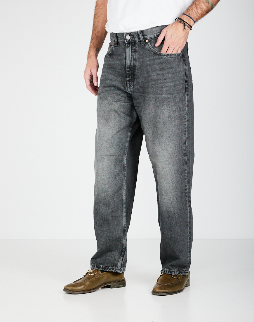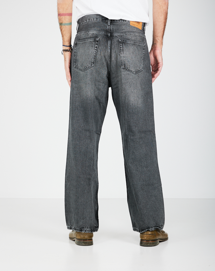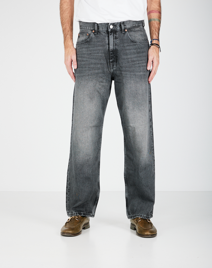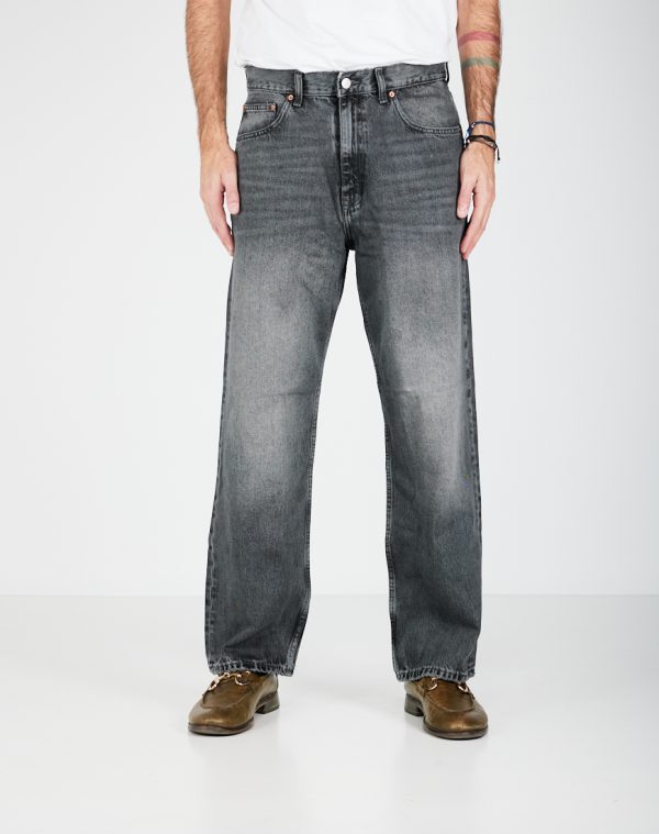 Jeans 5 tasche con cavallo basso e gamba larga con fondo 24 cm. Chiusura con bottoni in metallo