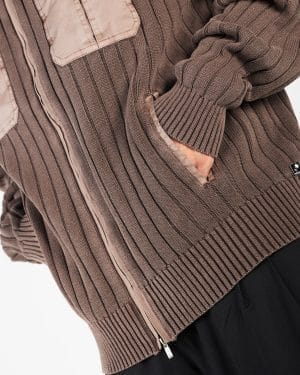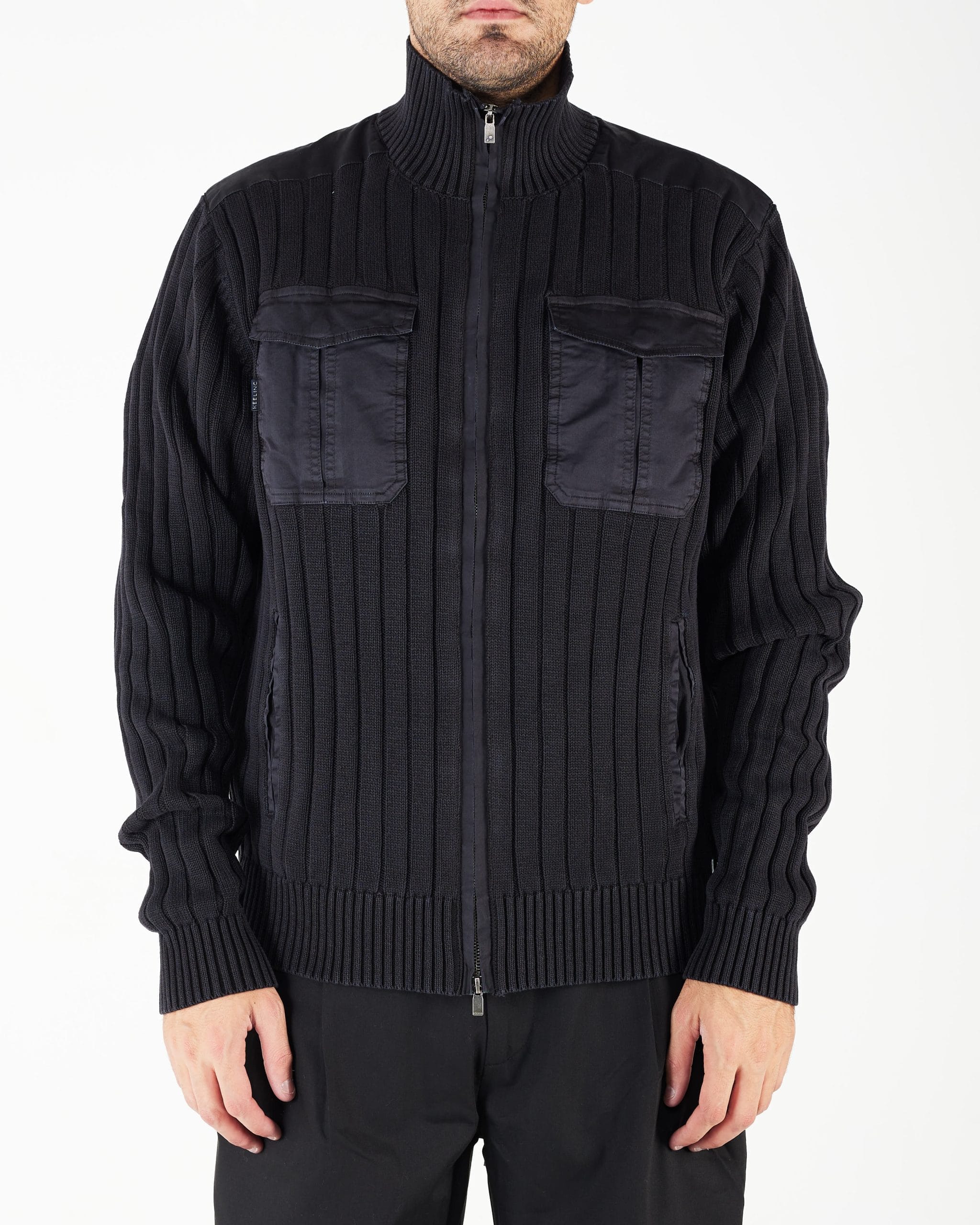 Maglia collo alto lavorazione a coste con elastico sui polsi e sul fondo. Chiusura con zip doppio cursore con tasche applicate e applicazioni in Nylon