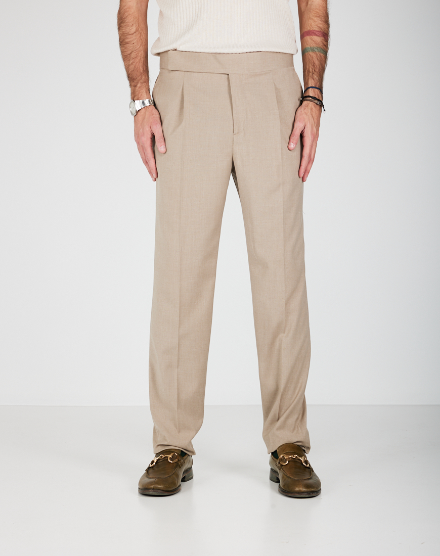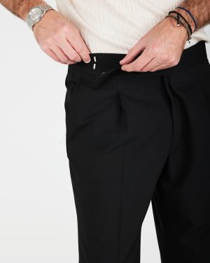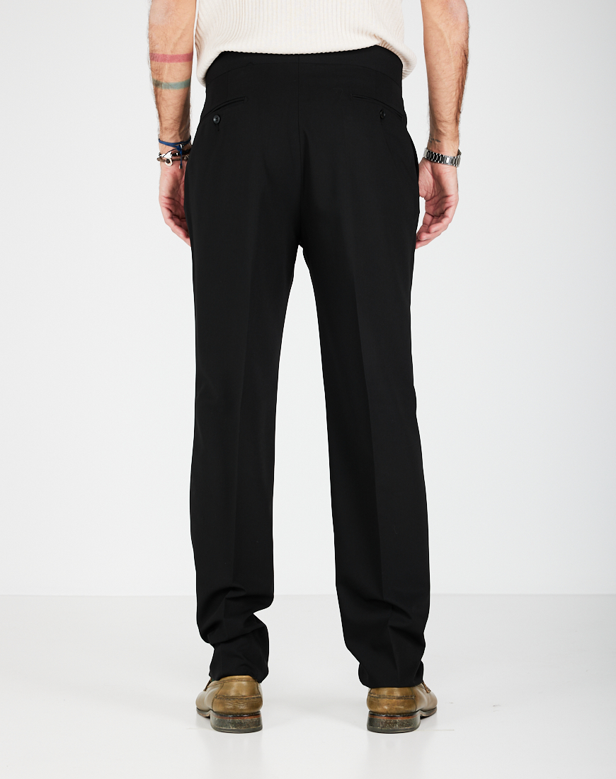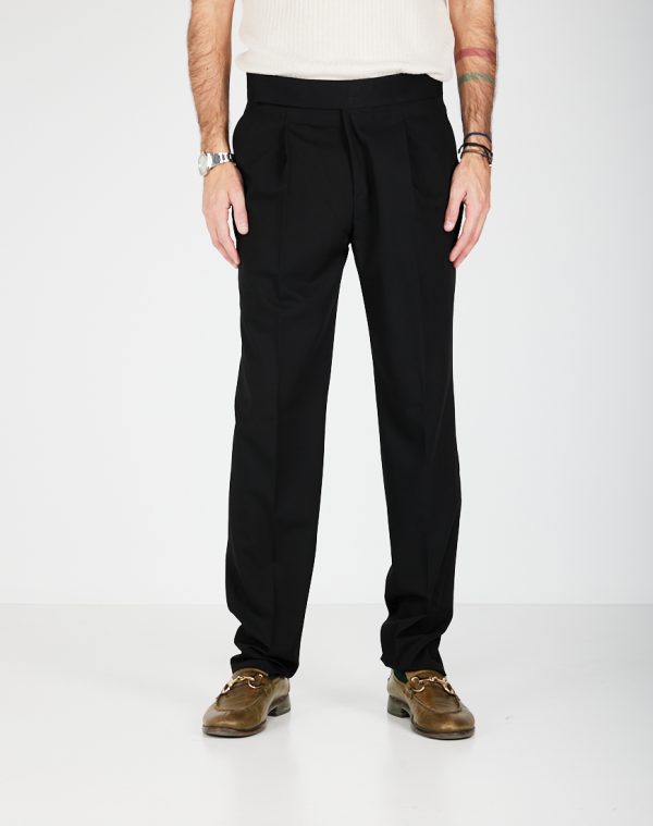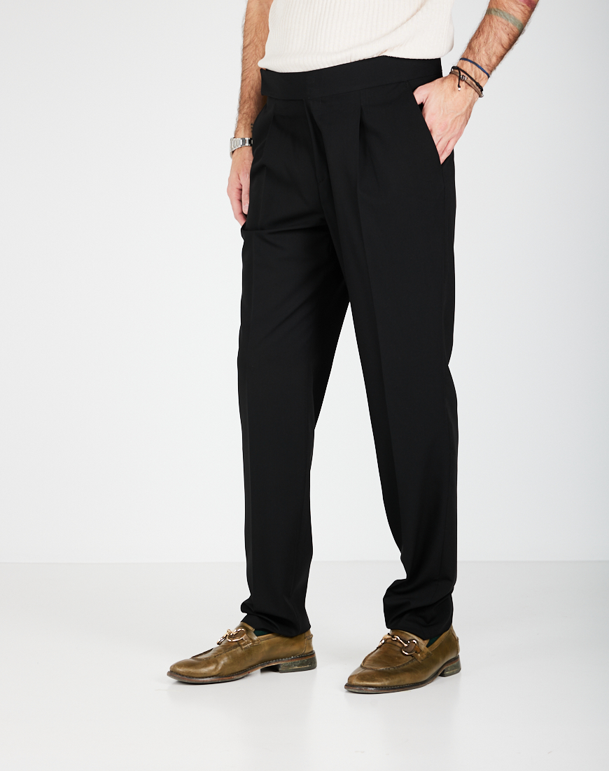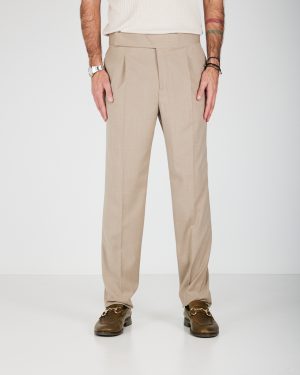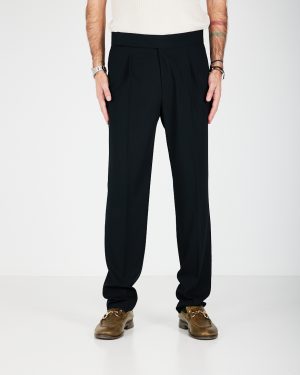 Pantaloni con 1 pence e chiusura con cintura laterale e zip. Cavallo regolare e gamba morbida con fondo 20 cm. Tasche anteriori a filo e posteriori a filetto