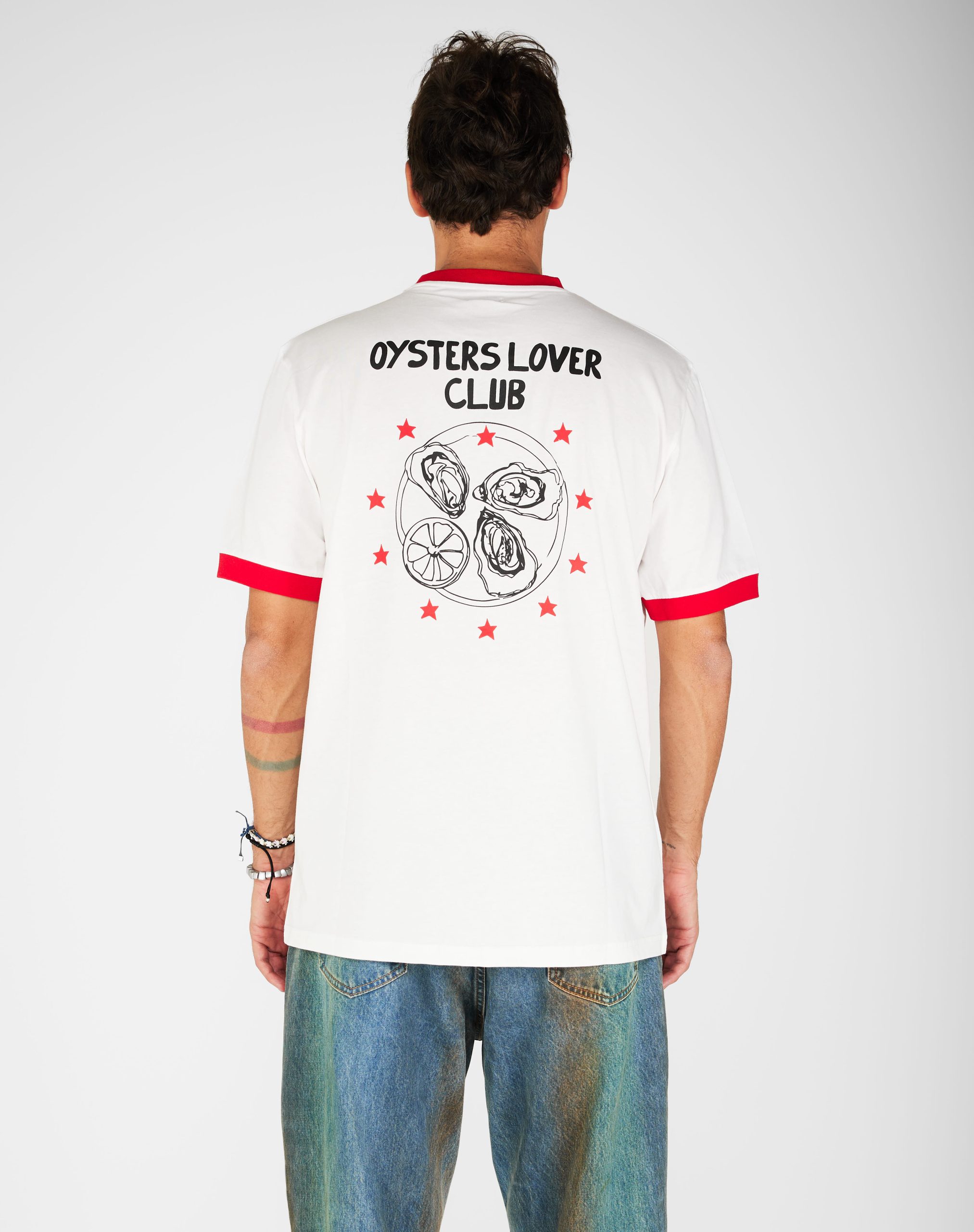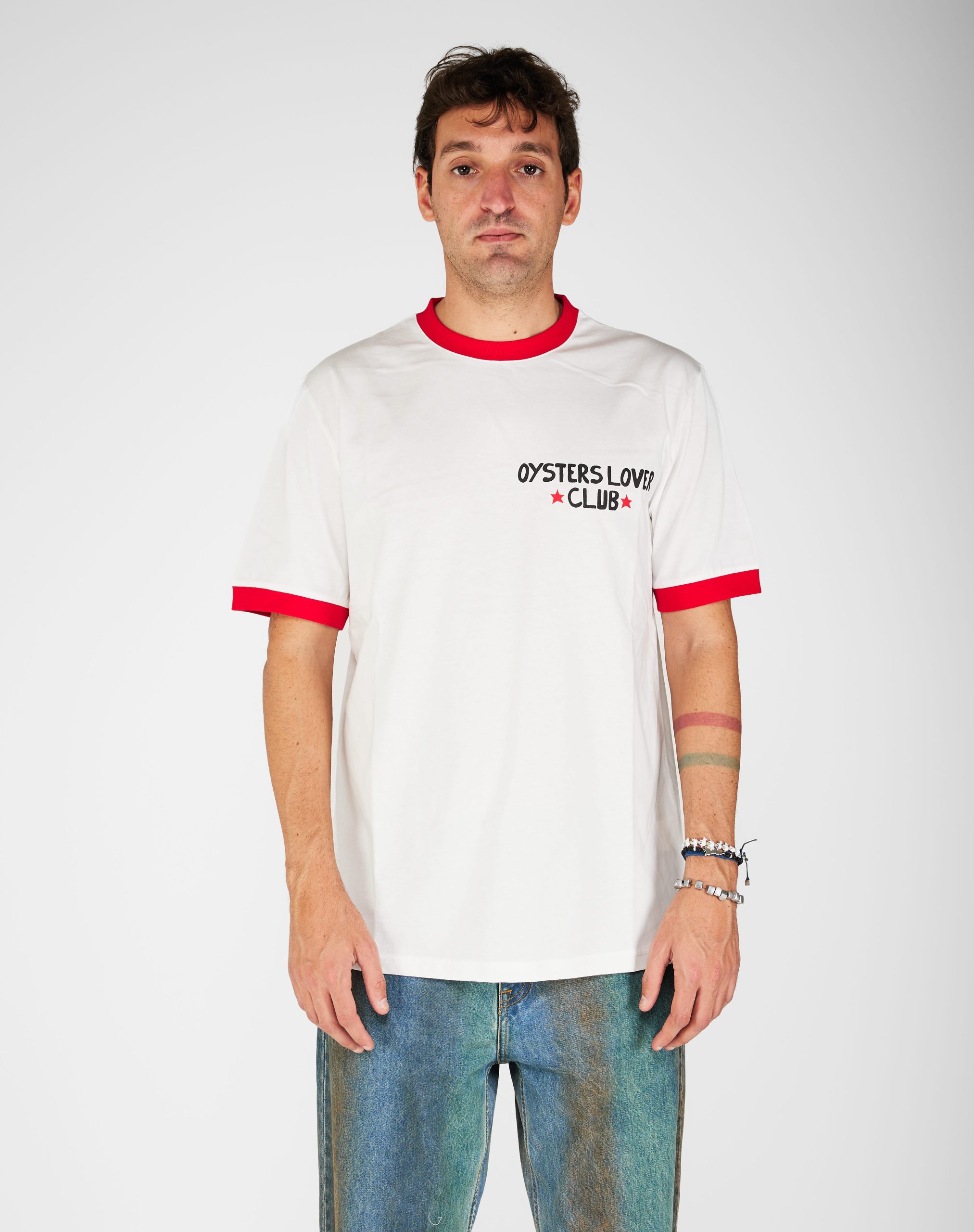 T-shirt girocollo con stampa in contrasto nella parte anteriore e posteriore. Elastico sul col e sui polsi in contrasto